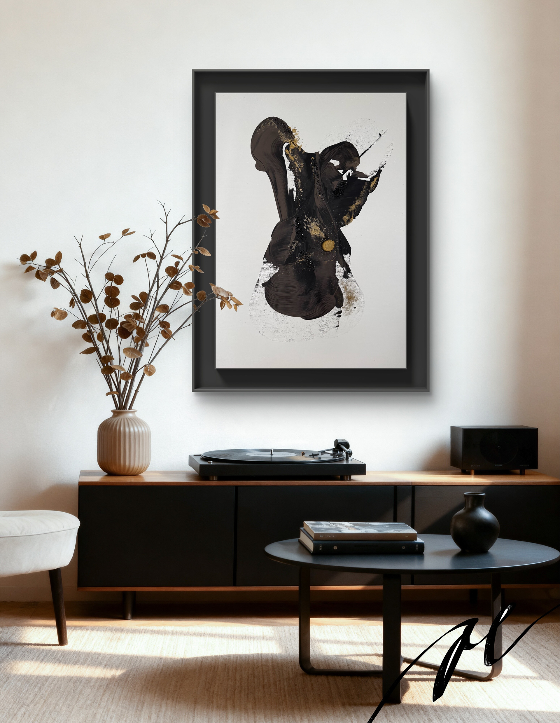 The painting carries the element of earth, bringing stability, and the element of fire, radiating energy and passion. On a dark background reminiscent of mahogany wood and smoldering coal, light veils of smoke rise. In the rhythm of invisible music, they transform into a dance of flames – delicate, yet powerful. The work connects earthly depth with ethereal lightness, as if fire and wood merged into a single melody.