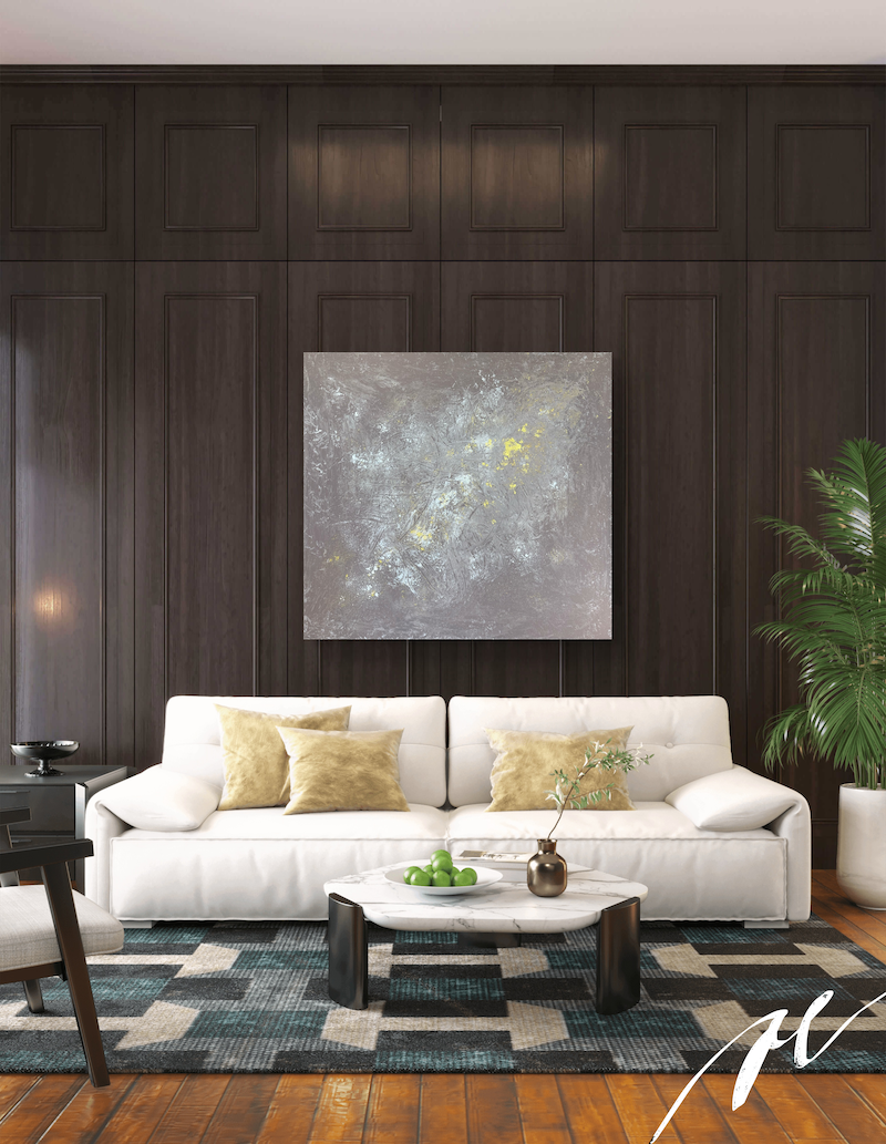 This two-part painting was created on November 11th, a day of a powerful manifestation portal, when the energy of the angel number 11:11 opens the way to making dreams come true. Abstract textures and dynamic strokes in shades of grey, white, and golden yellow evoke a stream of light cutting through the darkness – a symbol of hope, courage, and growth. The artwork is currently displayed in the Bernuss Beds showroom. Together, the canvases span three meters in width, but each piece is also available for purchase separately. Any space in which the painting is placed will gain not only a striking aesthetic feature but also a subtle energetic boost to support the realization of visions and goals.