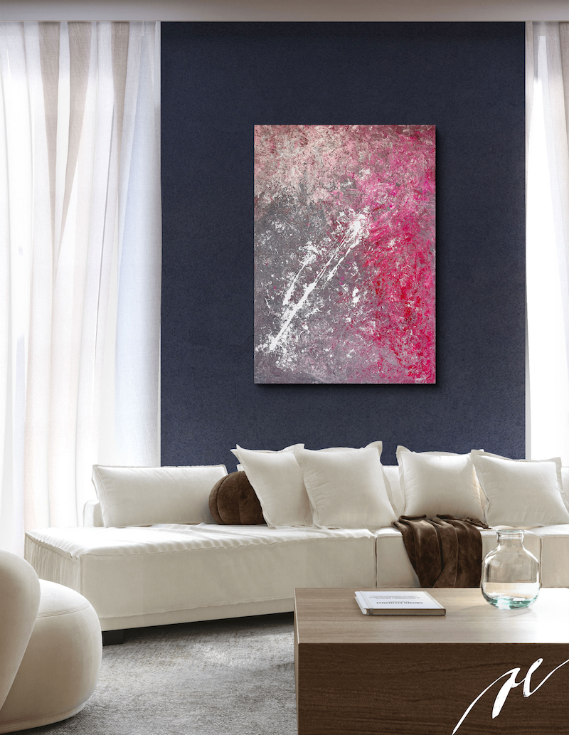 The painting “Ether” captures a delicate, protective space where new energy is being born. At its center, a luminous zone resembles a nest or a radiant glow from which something fragile and pure emerges. Bordeaux and pink lines spiral around this core, forming a flow of protection and connection, while golden accents bring a sense of sacredness and joy. Grey and white areas ground the composition, balancing its ethereal, dreamlike atmosphere.