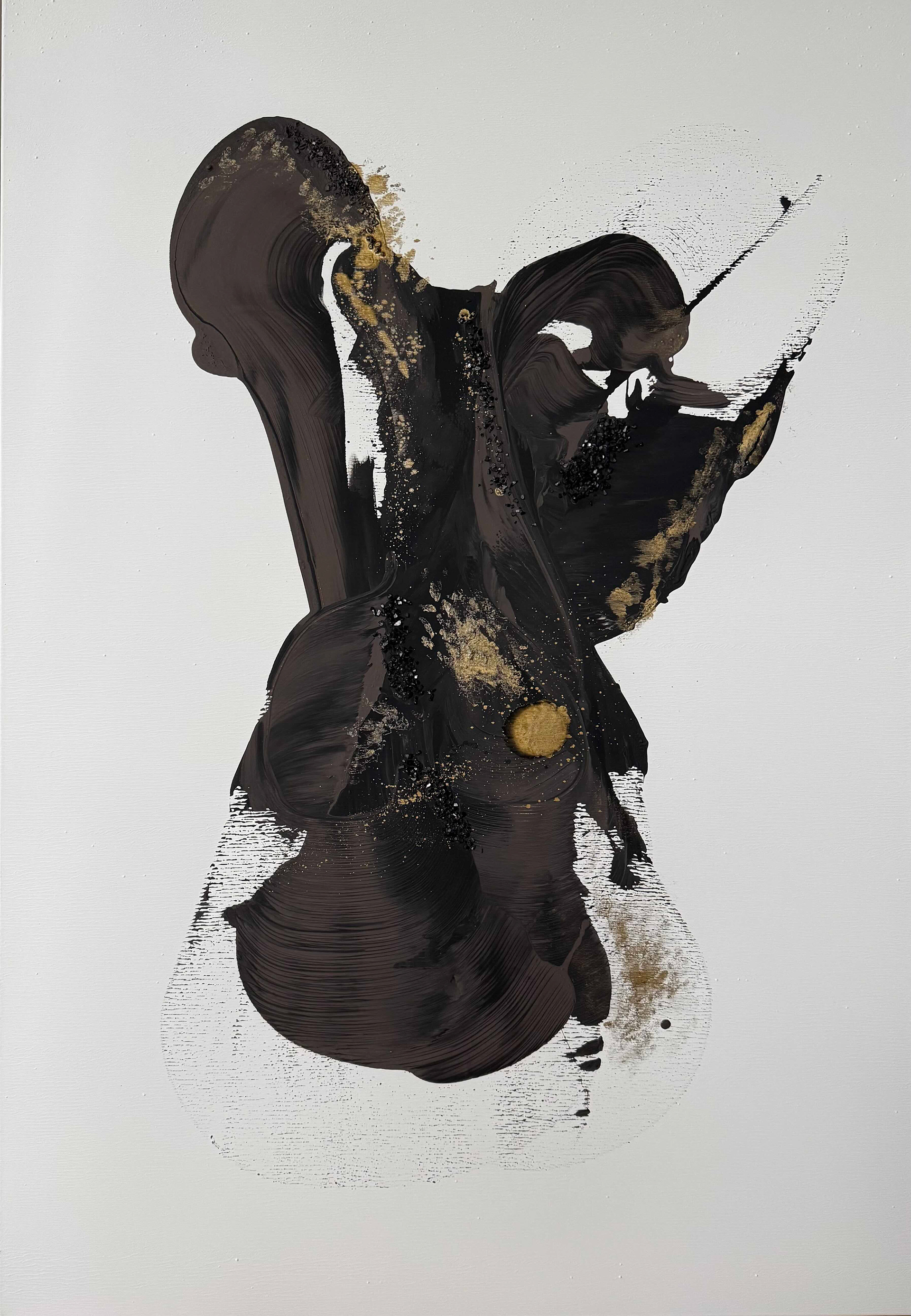 The painting captures the moment when movement and energy emerge from stillness. The texture of the surface creates a sense of tension and transformation, as if something is beginning to stir beneath it. Delicate golden accents appear like the first sparks of life, an idea, or a thought being born.