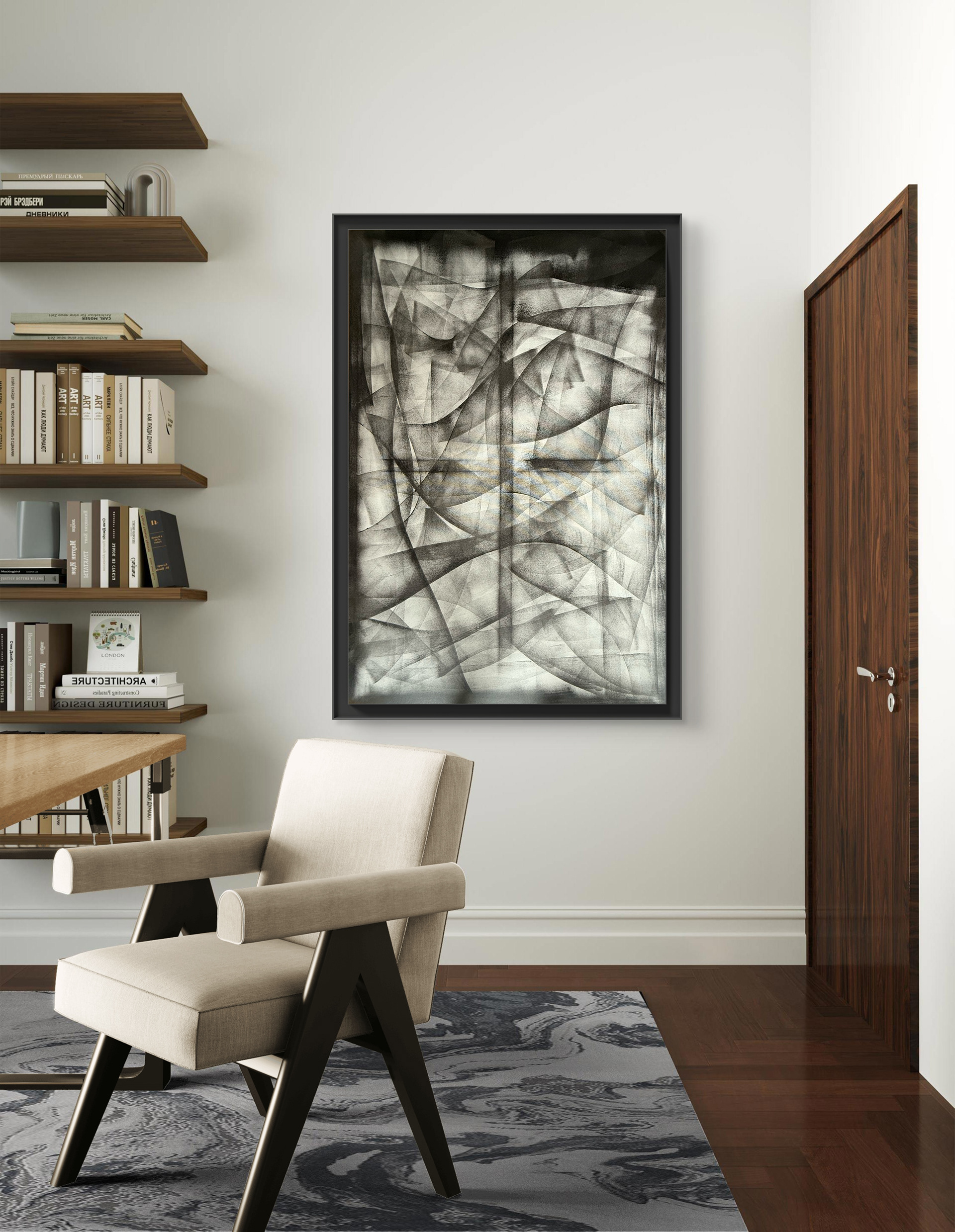 Linie a stíny se navzájem překrývají, jako by se různé identity střídaly na scéně - někdy jasně zřetelné, jindy rozpité a skryté.